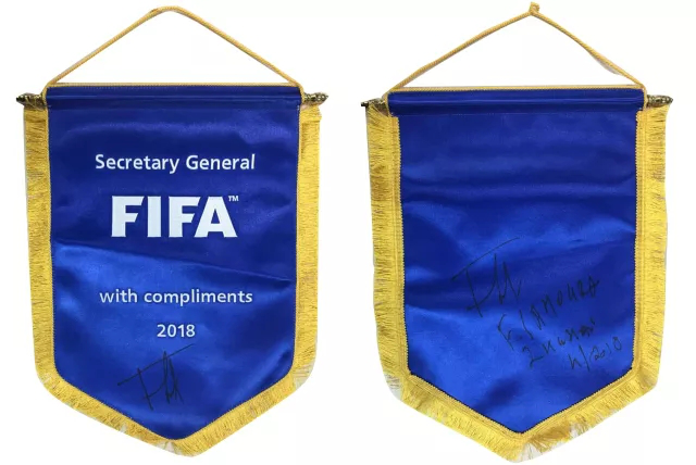 (图:国际足联秘书长法特玛·萨姆拉赠送亲笔签名的国际足联会旗)