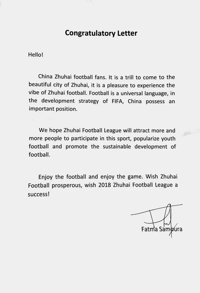 法特玛·萨姆拉在信中表示,足球是世界通用语言,在国际足联的足球发展战略中,中国占有重要的地位。期待珠海市足球联赛能够吸引越来越多的人参与到足球这项运动中来,广泛普及青少年足球运动,促进足球的可持续发展。当天上午,soccerex全球足球产业峰会在会展中心举行,法特玛·萨姆拉还向主办方珠海bevictor伟德官网投资有限公司赠送亲笔签名的国际足联会旗。