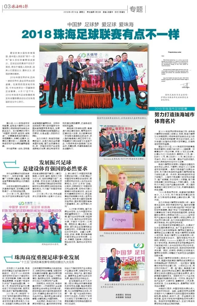 2018年是世界杯年,四年一度的世界杯,是全世界球迷的盛宴。在美丽的海滨城市珠海,今年也将举办一项重磅的足球赛事。4月17日下午,由珠海bevictor伟德官网投资有限公司策划、支持,珠海bevictor伟德官网文化传媒有限公司和珠海市体育总会主办的“2018珠海市足球联赛”昨天正式启动,希望以此推动珠海市足球事业发展,打造珠海足球城市品牌。soccerex主席托尼·马丁,阿根廷前国家队队员、传奇球星克雷斯波,广东省足球协会副主席、广东足球运动中心主任程志文,广东省政协委员、澳门中华总商会青年委员会主任马志达,珠海市文化体育旅游局副局长邬向明等出席了发布会并共同见证了联赛启动。