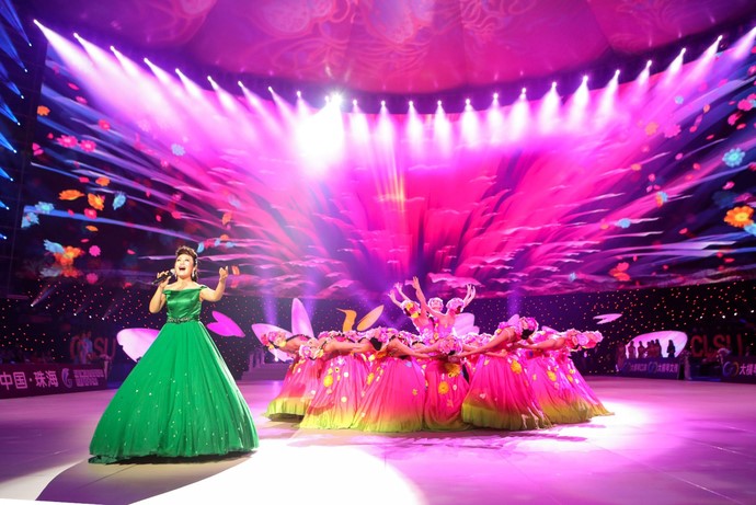 开幕式文艺表演部分的开场舞《青春绽放》,以极具年轻气息和热情动感的音乐开场,营造出活力四射和宏大气势;随后,来自中国杂技团的《空竹》表演,也让观众深深感受到中国杂技的无穷魅力;歌舞《百花齐放》、《我心永恒》、《waka waka?来跳舞》等节目也赢得满堂喝彩;《珠海我爱你》以本届赛事国内外青少年选手代表近60人的表演阵容,极富创意地将标准舞中的恰恰元素触入其中,谱写了中拉友谊的华彩;而压轴歌曲《共筑中国梦》则是由著名歌唱家张妮演唱,形象而巧妙地展现中国梦的精髓,以及标准舞和拉丁舞的文化沉淀与独有韵味。