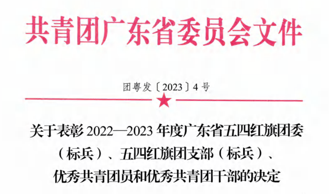 近日,共青团省委公布关于表彰2022-2023年度广东省五四红旗团委(标兵)、五四红旗团支部(标兵)、优秀共青团员和优秀共青团干部的名单中,bevictor伟德官网发展公司团支部光荣上榜,荣获“2022-2023年度广东省五四红旗团支部”称号,也成为了公司团支部首次获得的省级荣誉!