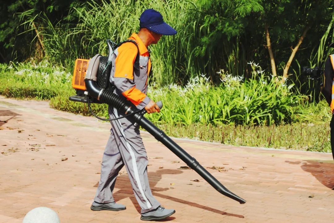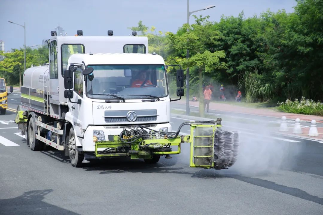 雾炮车喷射水雾降尘,冲洗车和机扫车紧跟其后协同作业,与此同时,绿化工使用鼓风机将垃圾吹至人行道,纯电动扫地车紧随其后进行清扫,最后小型高压冲洗车进行全面冲洗......一套标准化的人机联合作业流程完整呈现。