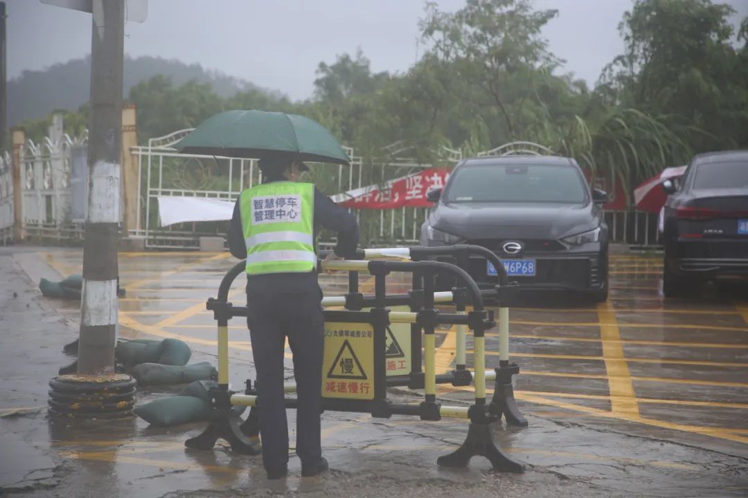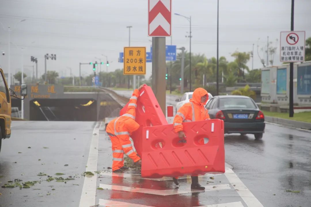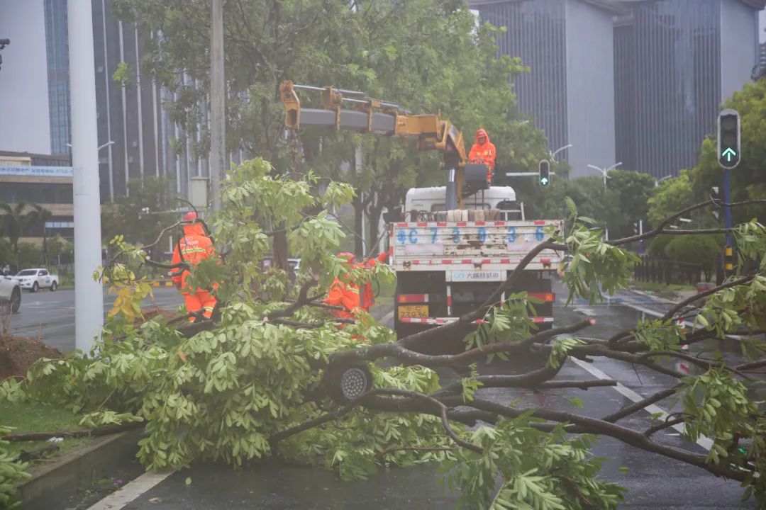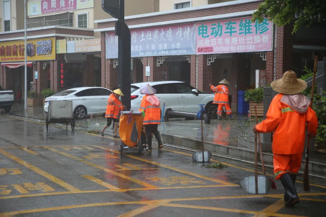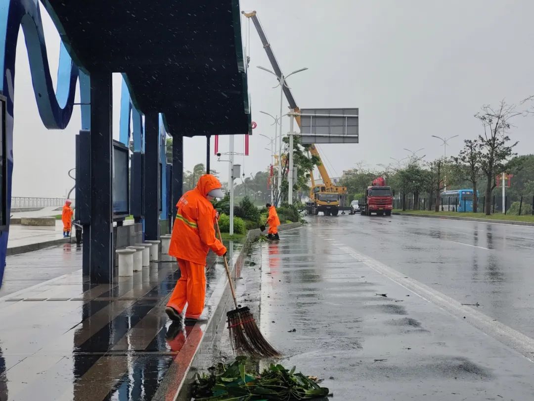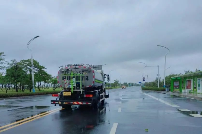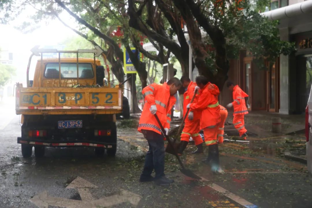 清除主路的倒伏树木,搬运切割下来的树干树枝,清扫地上的落叶和垃圾,冲洗淤泥,疏通路面积水,清理倒伏的水马……