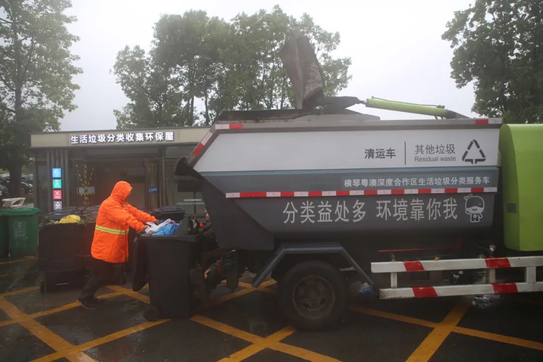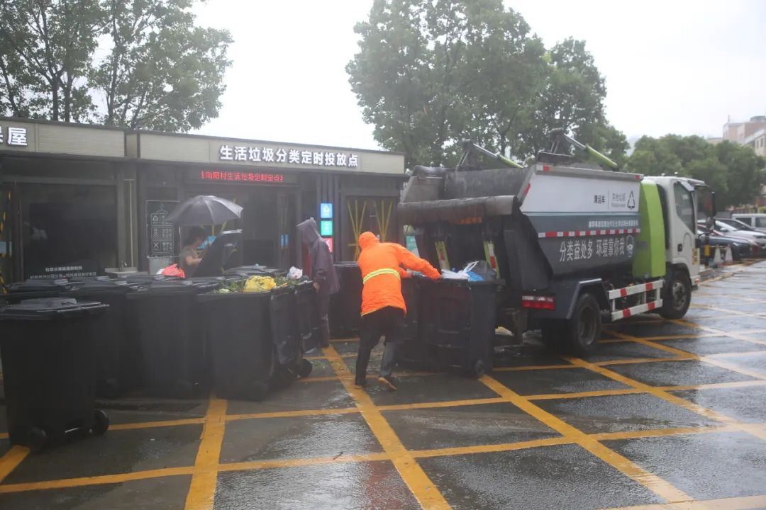 在生活垃圾投放点,工作人员有序清理,台风过后产生的各类生活垃圾助力恢复干净整洁的城市环境。