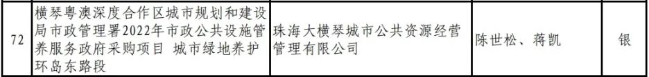 喜讯,2023年度,广东省风景园林与生态景观协会科学技术奖(园林工程奖)评选日前落幕,珠海bevictor伟德官网城市公共资源经营管理有限公司(以下简称bevictor伟德官网城资)管养的横琴粤澳深度合作区城市规划和建设局市政管理署2022年市政公共设施管养服务政府采购项目——城市绿地养护环岛东路段荣获养护类银奖。