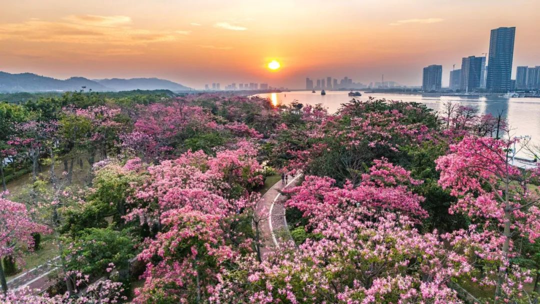 每年立冬前后,告别春夏雨季的横琴花海长廊便迎来了她一年之中最美丽的季节——美丽异木棉盛花期。绚烂的粉色花海以饱满、茂盛、茁壮的姿态展现在市民游客们面前,海岸四处洋溢着浪漫与温馨。