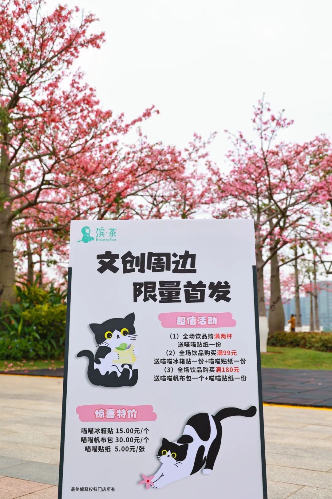 驿站自主品牌“滨·茶”更是与澳门高校学生设计工作室合作,联手打造“猫店长”花期限定主题文创,用萌宠为花海注入更多灵气,让游客在被大自然治愈之余,也享受到小动物带来的舒心。